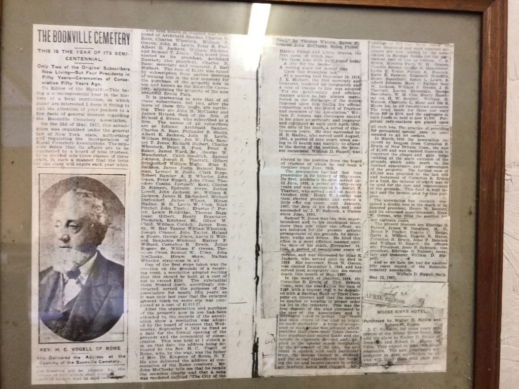 The first Board of Trustees was composed of Archibald Bamber, Charles N. Bass, Charles Wheelock, William F. Owens, John M. Lewis, Peter B. Post, Albert E. Jackson, William Stickney and Samuel T. Jones. The board then elected as its president, Archibald Bamber; vice president, Charles N. Bass; secretary and treasurer, J. Earl Hulbert. The sum of $2,190.00 was raised by subscription from parties desirous of owning lots in the new cemetery for the purchase of the property now in use and known as the Boonville Cemetery Association, and adjoining the property of the now beautiful Erwin Park.